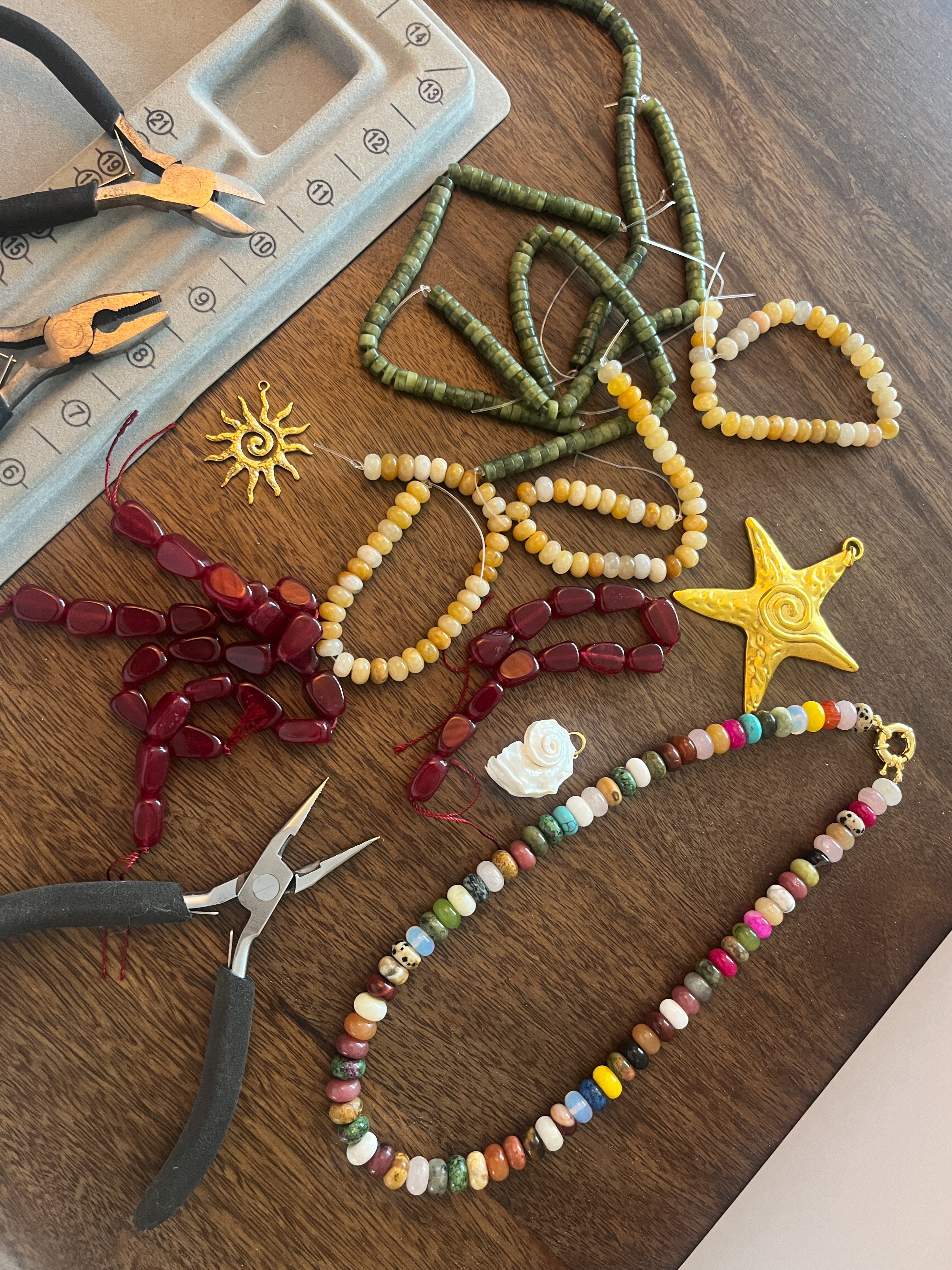 Thuis vond ze opnieuw haar eigen ritme. Ze begon sieraden te maken – kleine objecten die betekenis dragen. Niet zomaar accessoires, maar stukken die een verhaal vertellen. Sieraden die kleur brengen in het dagelijkse leven, die veelzijdig zijn en mooi blijven, en die je op verschillende manieren kunt dragen.